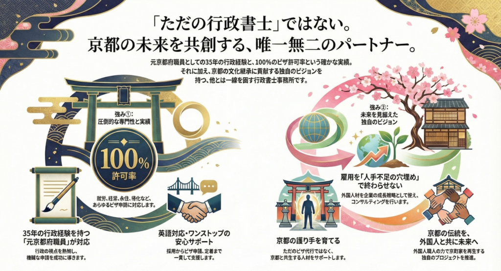 元京都府職員・35年行政経験:海外駐在・国際業務の実績を持つ行政書士が、 就労・経営・永住・帰化など複雑なビザ申請を確実に代行します。