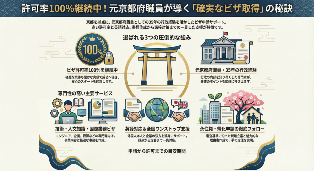 元京都府職員の行政書士が、就労ビザから永住権までを確実にガイド。必要書類の準備から面接対策まで、許可率100%の実績であなたの在留資格取得を全力サポート。