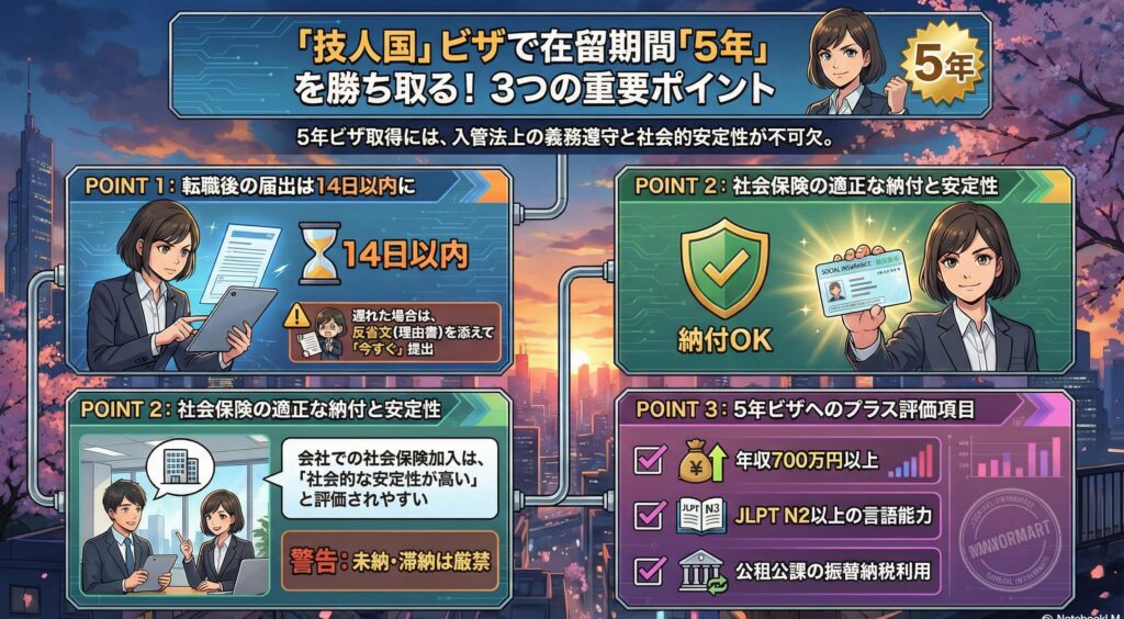 日本で働く多くの外国人の方が目標とされる「5年」の在留期間。そして、その先に見据える「永住申請」。 しかし、日々の業務に追われる中で、入管法上の義務をうっかり忘れてしまったり、雇用形態によって更新に不安を感じたりしている方も少なくありませ...