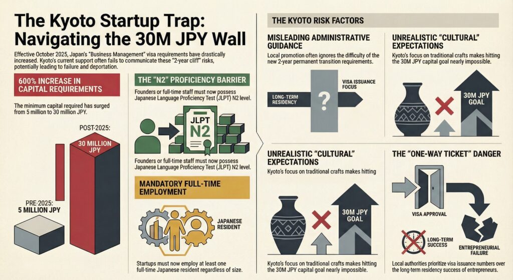 - Unrealistic demands on the "culture and art" sector: Kyoto Prefecture encourages entrepreneurship in traditional culture and social business, but it is extremely difficult to accumulate 30 million yen in capital and maintain full-time employment in these fields within just two years.
