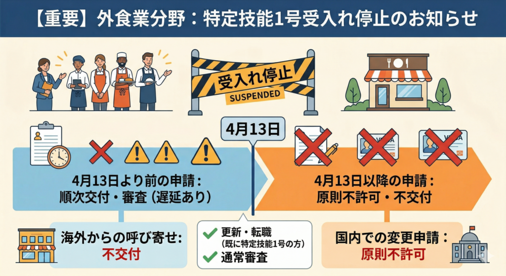 | 新規採用の中止 | 4月13日以降、海外からの新規呼び寄せや、留学生からの資格変更による採用は事実上不可能になります。 |