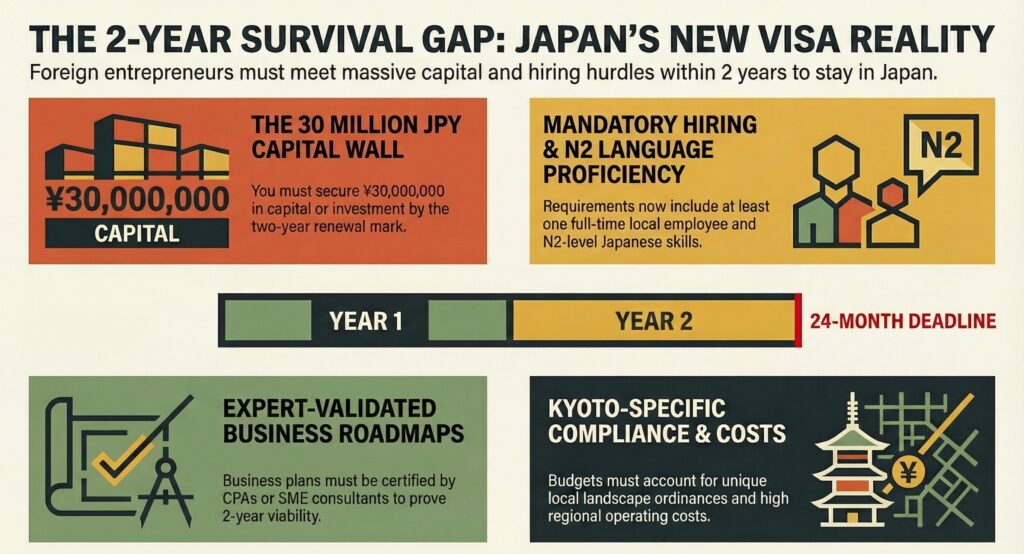 Los empresarios extranjeros que sueñan con abrir un negocio en Kioto se enfrentan actualmente a una "barrera invisible" sin precedentes: debido a una enmienda legal en octubre de 2025, los obstáculos para pasar de un visado de puesta en marcha a un visado de "gestión y administración" se han elevado drásticamente a un capital de al menos 30 millones de yenes, el empleo de personal a tiempo completo y un alto nivel de dominio del idioma japonés (equivalente a N2). japonés (equivalente a N2).