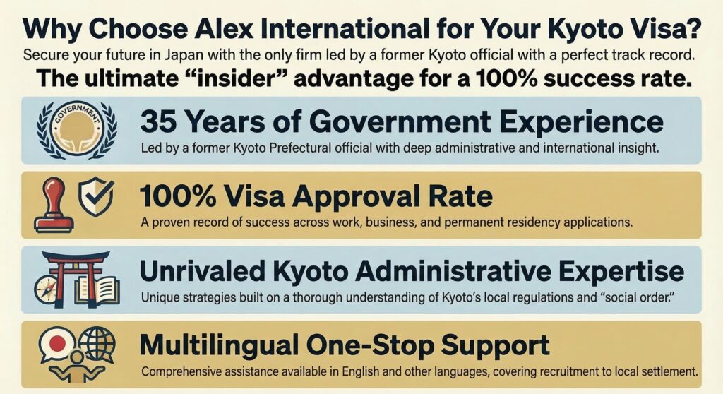 S'appuyant sur 35 ans d'expérience administrative en tant qu'ancien fonctionnaire de la préfecture de Kyoto, l'Alex International Office of Administrative Attorneys n'a pas pour seul objectif d'obtenir votre visa. Notre véritable mission est la suivante,Protéger la beauté du paysage de Kyoto et maintenir l'ordre dans la région.Il est situé à l'adresse suivante
