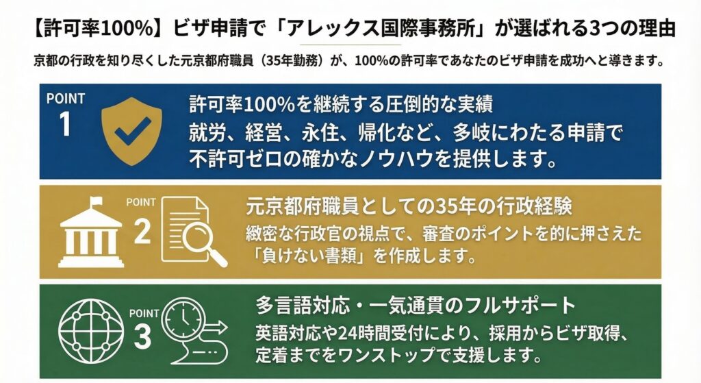 Les conditions requises pour demander un visa de travail à Kyoto sont un diplôme universitaire ou une expérience professionnelle d'au moins 10 ans, une rémunération équivalente à au moins 3 millions de yens par an et l'existence d'un contrat de travail. Si vous envisagez de demander un visa à Kyoto, nous pouvons vous aider à préparer les documents et à passer l'examen avec l'appui de notre taux d'approbation de 1001 TP3T. Renseignez-vous lors d'une consultation gratuite.Page de référence de l'Agence pour l'immigration et la gestion de l'immigration