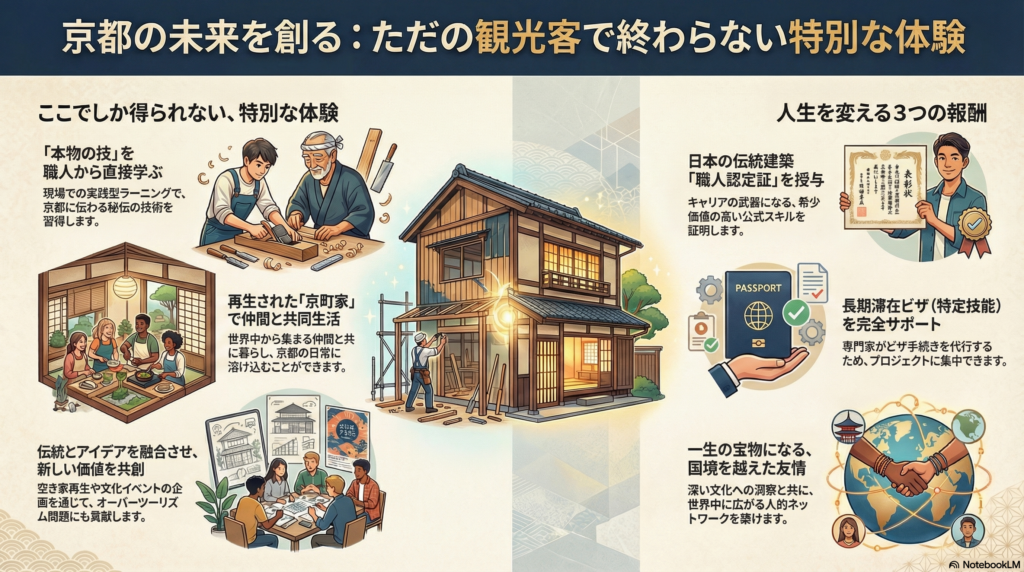 • Hands-on restoration: Revive empty homes, fight over-tourism, and help preserve Kyoto’s irreplaceable beauty.