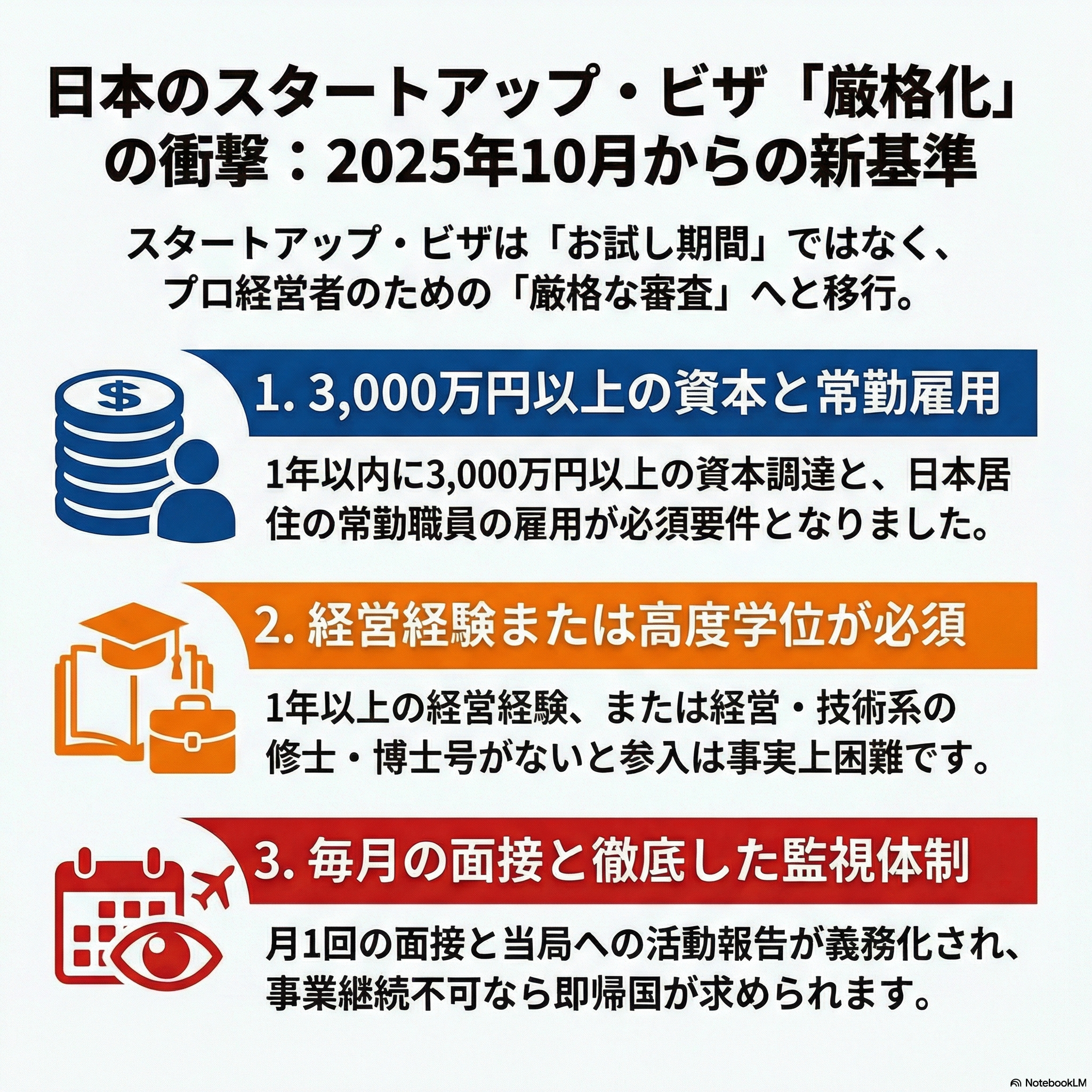 일본의 외국인 창업활동 촉진사업은 2025년 10월의 최종 개정으로 그 성격이 크게 바뀌었다. 과거의 '창업 준비를 위한 유예기간'이라는 달콤한 인식은 더 이상 통용되지 않습니다. 투자자들이 주목해야 할 점은 일본 정부가 이번 고시를 통해 사실상 '경영자의 품질 관리'와 '사업의 확실성'을 매우 높은 수준으로 요구하기 시작했다는 점입니다.